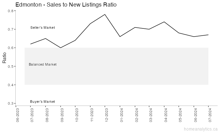 The sales-to-new-listing ratio for Edmonton in July 2024 was 0.68. SNLR of over 60% is considered a seller’s market.