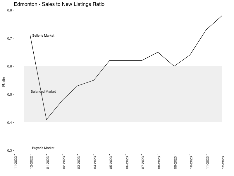 The sales-to-new-listing ratio for Edmonton in December 2023 was 0.78, indicating a healthy balance between supply and demand in the market.