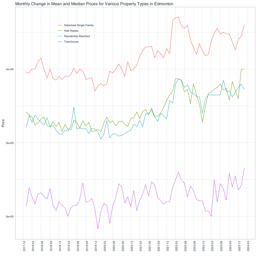 - The average price of a half-duplex rose by 5.5% month-over-month to $402,774.8 and by 10.3% year-over-year. The median price remained relatively unchanged compared to the previous month, sitting at $400,000, but showed an 8.4% increase year-over-year.